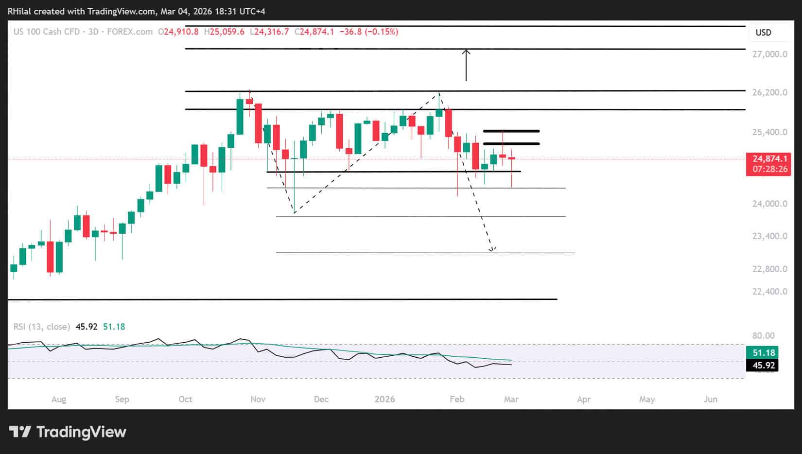 رغم الارتداد من 24,300، لا يزال المؤشر يواجه مقاومة قرب 25,000، في ظل تماسك ممتد دون 26,300 منذ أكتوبر 2025. مؤشر القوة النسبية RSI دون مستوى 50، ما يعكس ميلًا هابطًا.