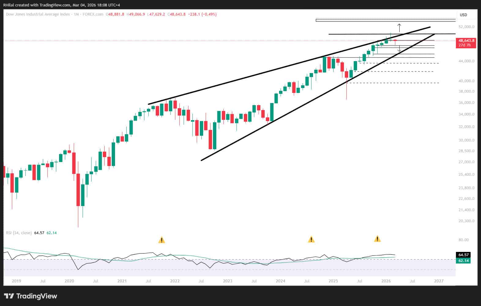 من منظور شهري، الاتجاه الممتد بين 2020 و2026 ترافق مع زخم شرائي مفرط شبيه بما شوهد في 2021 قبل تصحيح ممتد. التكوينات القطرية غالبًا ما تسبق تراجعات أوسع، خاصة مع استمرار ضغوط الذكاء الاصطناعي وتوقعات تثبيت الفائدة وتصاعد المخاطر الجيوسياسية.